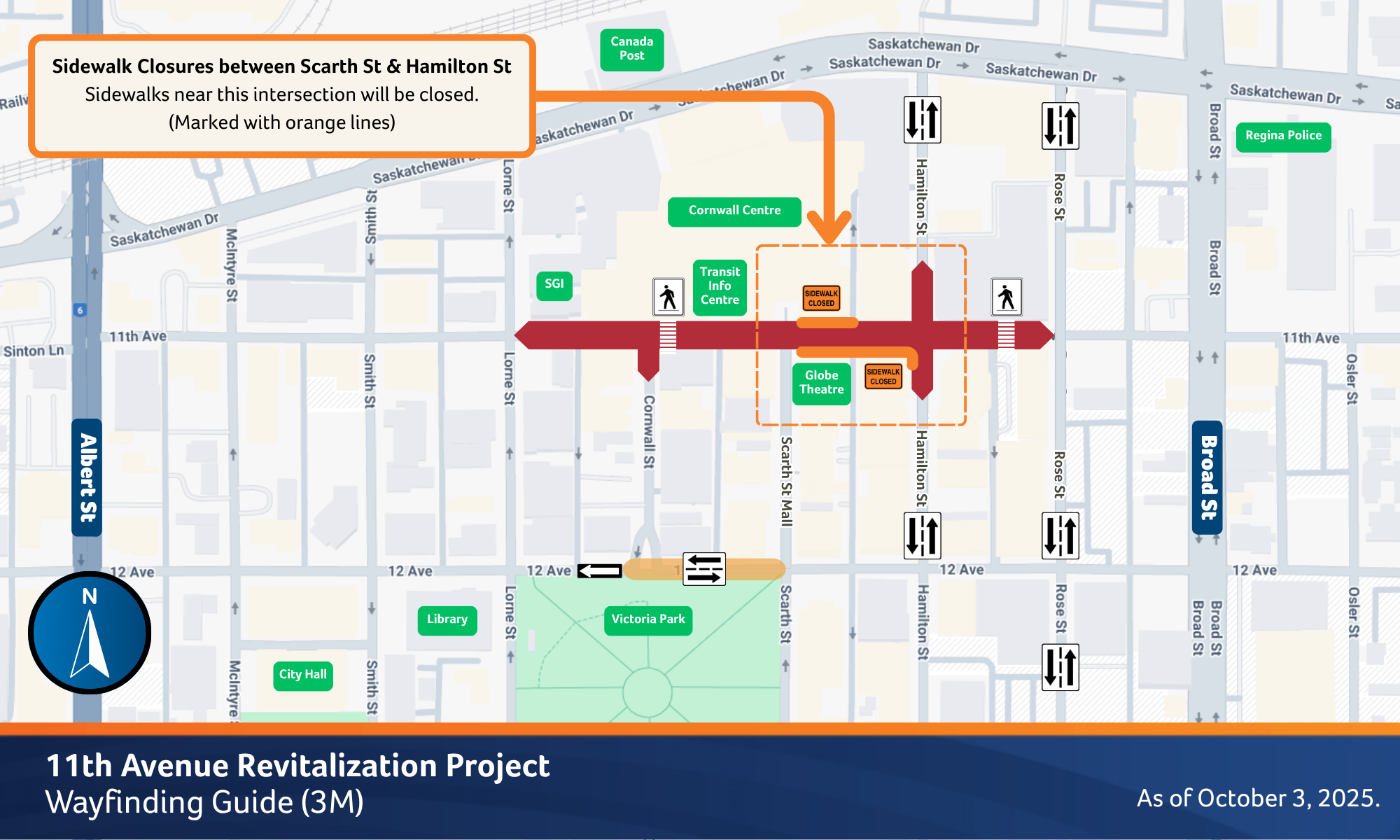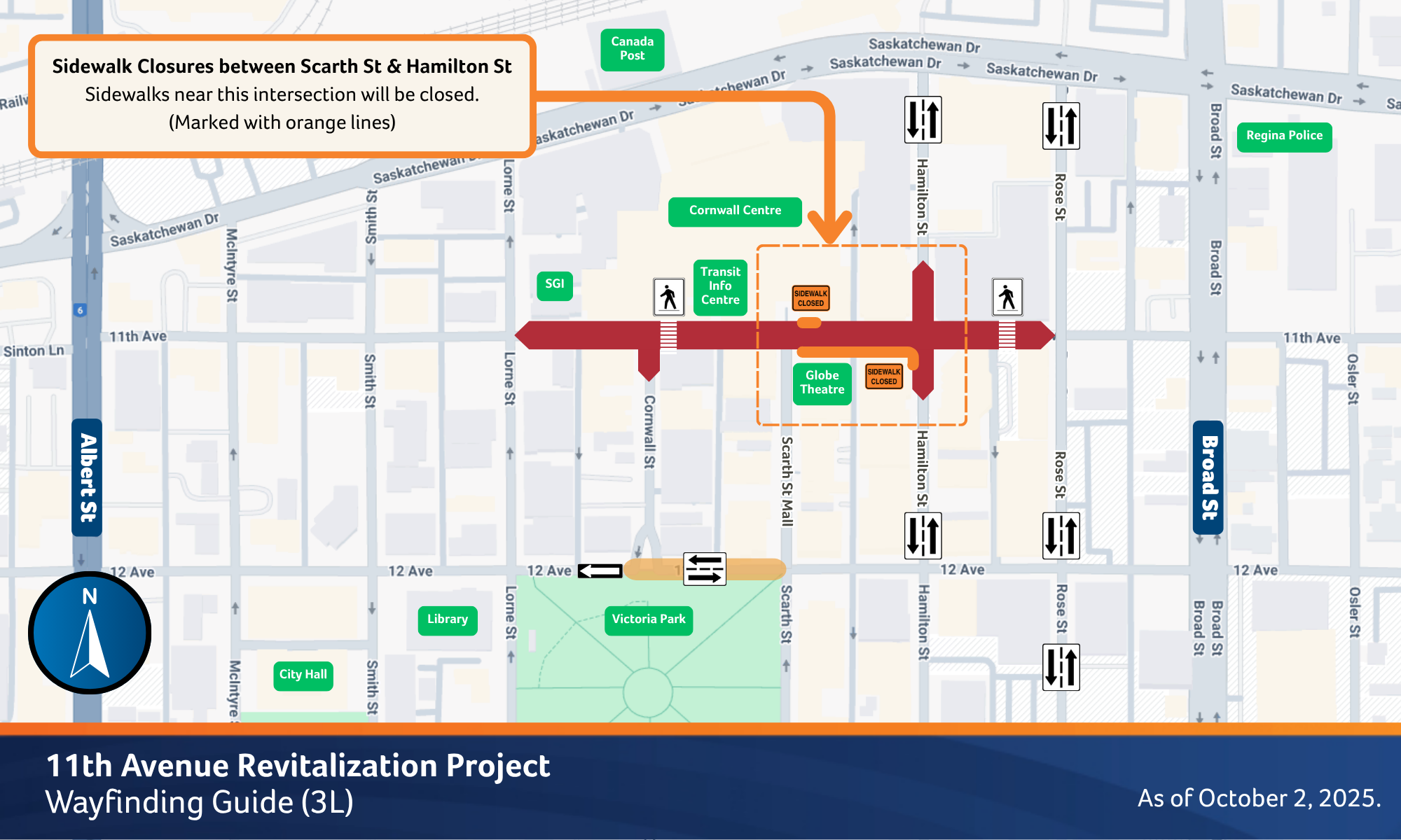 - Closure 3L: Starting October 2, sidewalks on both sides of 11th Avenue, between Scarth Street and Hamilton Street, will be closed.